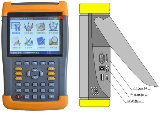 多功能手持式全自動變比測試儀頂端部分是變比測試航空插頭,高壓側(cè),低壓側(cè)端子。多功能手持式全自動變比測試儀的正面上部是彩色液晶屏,多功能手持式全自動變比測試儀的下部是標(biāo)準(zhǔn)30鍵的控制鍵盤;在多功能手持式全自動變比測試儀的右側(cè)打開支架可看到USB接口、充電接口、RS232接口。